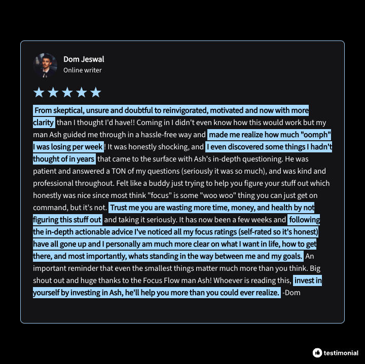 I quit doing the work I hated - my lucrative job, my misaligned business, and my startup with multi-million dollar potential.I stopped rejecting my soul and started soul-searching.But it wasn’t until I eliminated the distractions I was using to fill the emptiness in my soul that I had the space and energy to discover what I wanted from life and build it through focused effort.I learned that focus isn't just about systems, discipline, and willpower—it's about discovering what distracts you, eliminating those distractions, and resisting the addictive, mentally draining nature of modern society.Once I removed the distractions in my life, the focus tools, systems, and tactics became exponentially more effective and focus became effortless.My life became unrecognizable:- I’ve removed all of my major distractions, addictions, and vices that were destroying my life and stealing my time, energy, and motivation
